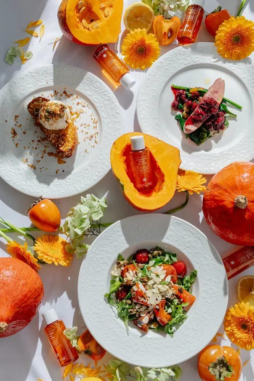 Осень — время замедлиться и прислушаться к себе. Это настроение легло в основу меню, созданного шеф-поваром Дмитрием Паляничкой. В нём сезонные продукты и естественные оттенки осени сочетаются с мотивами линии MAXCLINIC. Среди блюд — утка в пьяной вишне со шпинатом, копчёный салат с миндалём, хурмой и страчателлой, лимонный кекс с тыквенным гелем и чай с календулой и мёдом.