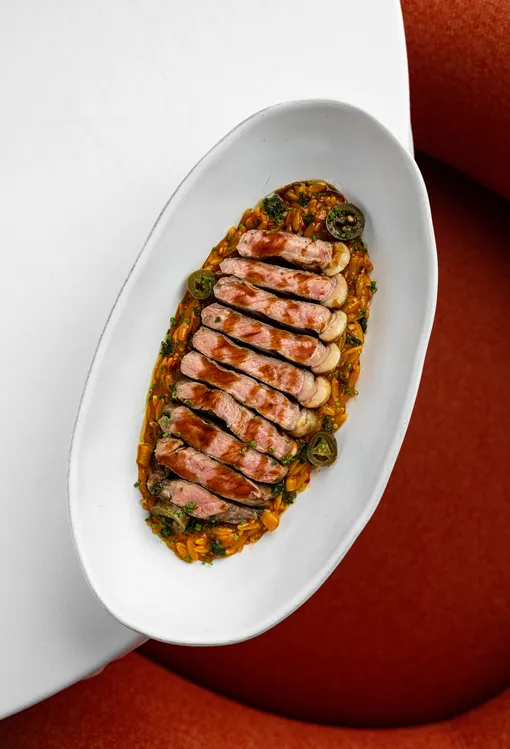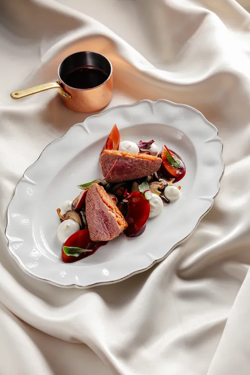 Меню обновляется и подается с личными заметками шефа, оно построено на идее интуитивной кухни: каждый продукт — главный герой, каждый сезон — отправная точка. Гости здесь получают комплимент от шефа — продукт почти в исходном виде, чтобы почувствовать суть: томат с урбечем, крудо из кабачка, молодой картофель с оливковым маслом. В закусках — тартар из свеклы с малиновым уксусом, форель с соусом из пряных трав, томаты с бурратой и эстрагоном, угорь с рамиро от фермеров. В качестве горячего шеф предлагает утиную ножку с бататом и цитрусовым жу, пасту с кроликом и шалфеем, мурманскую треску с черными лисичками. Из десертов обрати внимание на чизкейк с бананом и кофейным муссом и парфе из малины с мороженым из мацони по рецепту из Осетии.