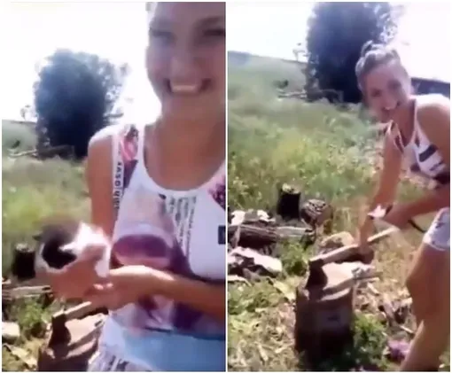 22 июля в Сети появилось видео, на котором девочка рубит котенка топором и смеется. Ее подруга комментирует видео, снимая все это на камеру. Вскоре выяснилось, что героини ролика — 15-летняя Екатерина Штраух и ее 14-летняя сестра Виктория из села Михайловка Алтайского края. Девочки — дочери главы Михайловского совета.