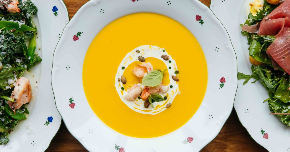 Среди закусок — брускетты с ростбифом и трюфельным кремом, сырные пончетти, дуо крудо из тунца и лосося, а также обновленные чикетти. В салатах акцент на баланс: нисуаз с подкопченным тунцом, буррата с копчеными овощами, зеленый салат с креветками и семенами. Выбирая горячее, нельзя пройти мимо дорадо аль аква пацца, баклажана пармиджано и стейка Денвер с перечно-грибным соусом. Безошибочный выбор — пряный крем-супом из тыквы с креветками (на обложке дайджеста).