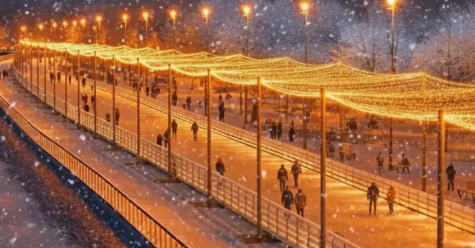 Каток площадью 13 500 м² — это целый световой город с гирляндами из 14 миллионов светодиодов, лаунж-зонами и зимним тоннелем. Пространство, где одновременно могут комфортно кататься до 2 500 человек.