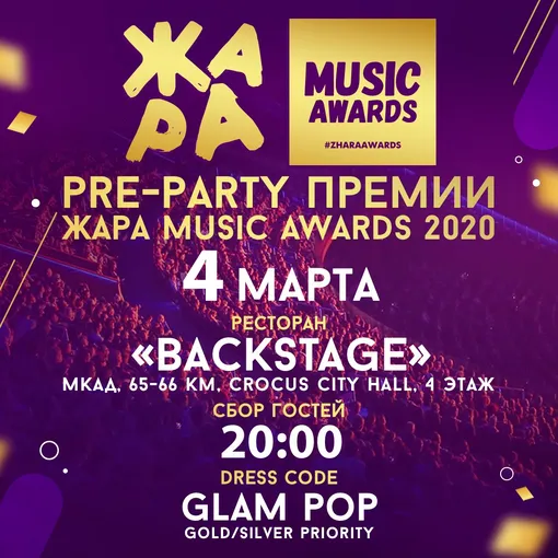«ЖАРА Music Awards» — самое долгожданное музыкальное событие года. Здесь открываются новые имена и побеждают лучшие из лучших! 4 апреля 2020 года в Crocus City Hall состоится III церемония награждения музыкальной премии «ЖАРА Music Awards».
