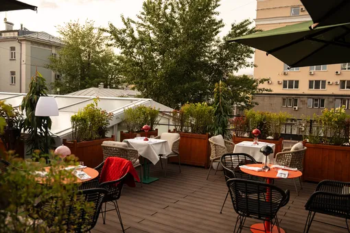 «Выше крыши» — такое название получила поп-ап веранда на Большой Никитской, 58 совместный проект двух расположенных по соседству ресторанов. Дизайн эклектичный, желто-розовый бар похож на леденец, много зелени, а еще — нет ни машин, ни пешеходов. В меню - микс блюд двух заведений: брускетты и разнообразие роллов, фирменная пицца и лепешки из печи, паста и ризотто. И, разумеется, сорбеты, джелато и десерты. Вход через Historia.