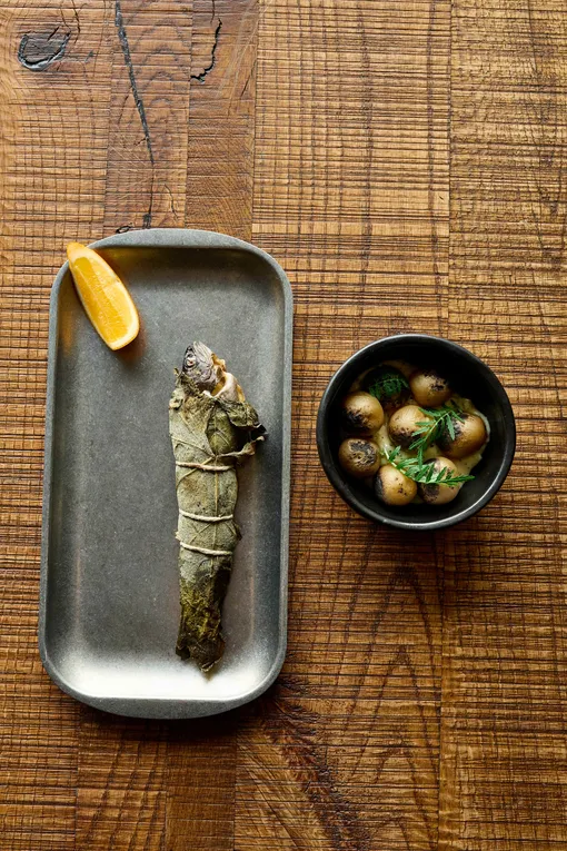 Настоящий телепорт в жаркий июль — салат из арбуза и томатов с дагестанским сыром и огуречным льдом, а салат с листовыми овощами, маринованными кабачками и кашей из гороха и опаленной цветной капусты — продвинутая сытная версия зеленого салата, уже перешедшего в разряд «московской классики». В дровяной печи готовят сома в водорослях и полевом сене с кукурузной кашей, палтуса с картофелем и белым соусом, а также радужную форель в виноградном листе с тархунным соусом. Цыпленка жарят на углях и подают с кабачковыми оладьями, утку комбинируют с травами, сливой и вишневым соусом, а кролика дополняют хрустящей аджикой. Ягненок на углях появляется на столе в компании зелени и балкарского чесночного соуса тузлук. А на сладкое непременно нужно брать щавелевую «павлову».