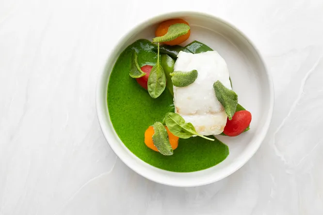 Спинка трески, велюте из шпината, печёные томаты — 890руб.