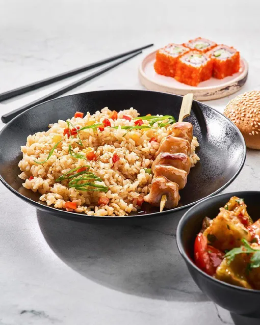 В меню – четыре варианта: ланч с бургером (для мясоедок, которые любят вонзить зубы в сочную котлету), с курицей (в составе – ролл «Калифорния», салат кофу и тяхан с курицей), с лососем и курицей (чикен спайси, ролл с лососем, овощной салат) и с креветками и курицей (лапша с курицей, ролл «Окинава», салат сендай).