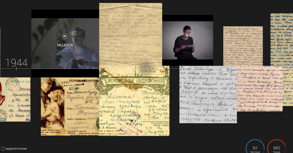 Все загруженные документы, а также видео-версии, будут доступны в форме временной линии. Письма 1941-1945 годов прочитали Игорь Бутман, Артём Каминский, Алексей Кортнев, Константин Крюков, Кирилл Серебренников, Алёна Долецкая, Яна Чурикова, Ольга Шелест и другие знаменитости.