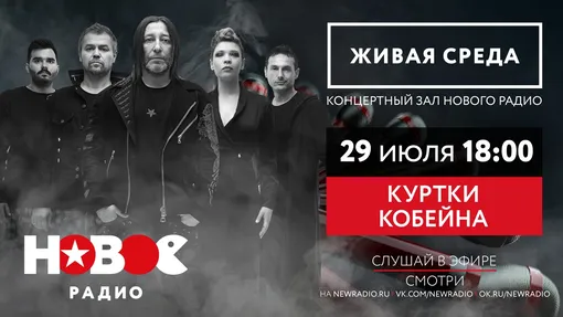 29 июля очередном выпуске программы «Живая среда» супергруппа «Куртки Кобейна» в составе Шуры Би-2 и Zventa Sventana (Юрий Усачев и Тина Кузнецова) исполнит свои хиты «Нити ДНК», «Люди на эскалаторах», «Мой рок-н-ролл» и другие. Услышать выступление музыкантов в концертной студии «Нового Радио» можно будет в прямом эфире, а увидеть в интернет-трансляции.