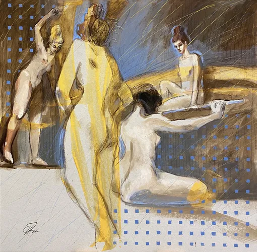 Эффектная работа с цветовыми пятнами, смешение прозрачных слоев с пастозными мазками, трафарет и уверенная линия карандаша – вот основные художественные приемы, присущие творчеству Натальи Ушаковой. В этом году на Art Russia автор представит проект «Нимфы большого города», посвященный жизни современной женщины. Как бы ни хотелось оставаться нежной и хрупкой и летать в облаках в образе загадочной нимфы, приходится отвечать на вызовы времени: быть сильной и гибкой, все время в движении и не останавливаться в своем развитии. В то же время нужно сохранять свою природу, вопреки разрушающей центробежной силе мегаполиса и привносить собой гармонию в хаос повседневности. Многофигурная композиция в работах передает ощущение выхваченных из киноленты жизни кадров, быстро меняющихся и создающих единое непрерывное движение на холсте.