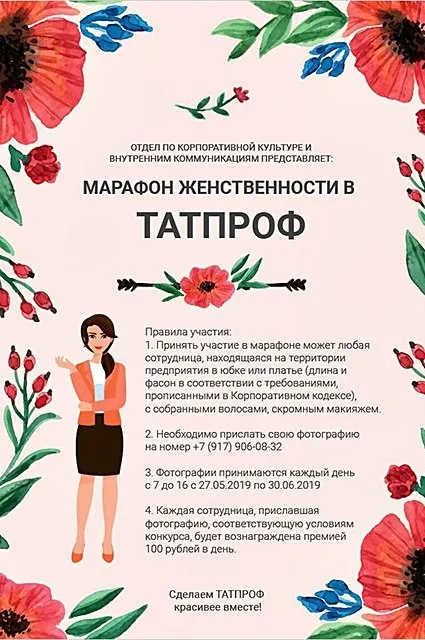 Руководство предложило сотрудницам приходить на работу в юбках или платьях — «традиционной женской одежде». Рекомендуется также собрать волосы, сделать скромный макияж и прислать свои фотографии администрации. За выполнение всех условий полагается премия — 100 рублей в день.