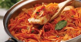 - На прогретом растительном масле в большом сотейнике в течение 5 минут обжарь сначала морковь, затем репчатый лук.
