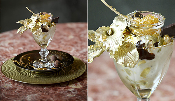 Самое дорогое и необычное в мире мороженое можно отведать в дорогих ресторанах США. Оно называется Золотым мороженным и одна порция этого лакомства обойдется примерно в 1000 долларов. В стаканчик с великолепным десертом кладут слои золотой фольги толщиной менее 0,08мм, а также редкие ягоды и фрукты. Кушать блюдо необходимо вместе с фольгой из золота. Она настолько тонкая, что для организма человека абсолютно безвредна.