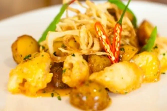 Делаем соус: в сковороде смешиваем кокосовое молоко, чили-медовый соус и сливочное масло, добавляем в соус картофель с кальмарами и тушим в сковороде около 1 минуты. Добавляем чили перец по вкусу. Затем добавляем рубленную петрушку, перемешиваем, выкладываем на тарелку. Украшаем сверху луком во фритюре и свекольным листом. Приятного аппетита!