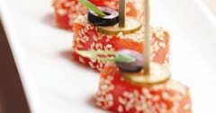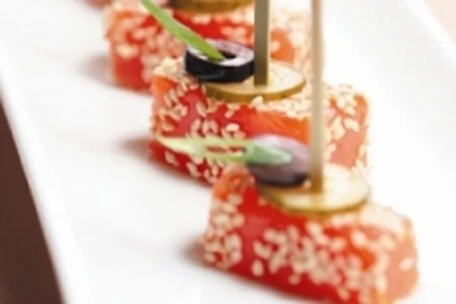 Филе лосося маринуется в соли, сахаре и ломтиках свежего сочного апельсина. Благодаря этому маринаду филе обретает нежный вкус, который дополняется ароматом слегка обжаренных семян белого кунжута, легкой кислинкой корнишонов и пикантностью черных оливок.
