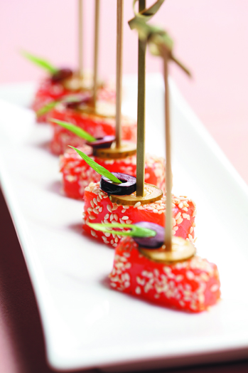 Благодаря этому маринаду филе лосося обретает непередаваемо нежный вкус, который прекрасно дополняется ароматом слегка обжаренных семян белого кунжута, легкой кислинкой корнишонов и пикантностью черных оливок.