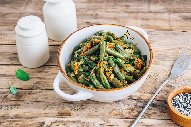 Сочетание нежно обжаренной зеленой фасоли и моркови с орехово-пряной кунжутной заправкой идеально подходит для легкого основного блюда на обед или ужин или изысканного гарнира. Попробуй, ведь приготовить это блюдо просто и быстро — весь процесс займет у тебя примерно 35 минут.