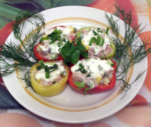 — 2-3 столовые ложки консервированной кукурузы — 1 соленый огурец — зеленый лук, укроп — болгарский перец — майонез Огурец нарезать кубиками, зелень и лук — измельчить, добавить кукурузу, тунец, майонез, все перемешать. Перец нарезать кружочками и заполнить их полученной смесью. Приятного аппетита! |