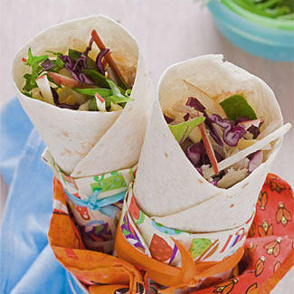 КАК ДЕЛАТЬ: Куриное мясо порви руками на длинные узкие кусочки. Нарежь яблоко на дольки толщиной 4–5 мм, а капусту нашинкуй тонкой стружкой. На каждую лепешку выложи слоями курицу, капусту, салатные листья и дольки яблок. Смешай устричный или соевый соус с йогуртом и полей начинку получившейся заправкой, затем сверни сэндвич трубочкой, предварительно подогнув нижний край лепешки.
