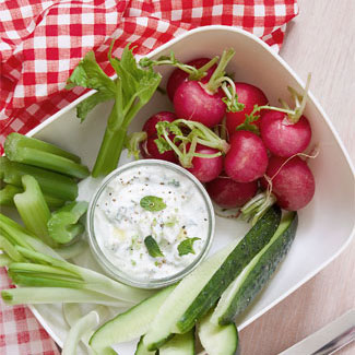 КАК ДЕЛАТЬ: Не разрезая лайм, натри на мелкой терке его цедру и выжми сок из самого плода. Фету разомни вилкой, смешай с соком и цедрой лайма и оливковым маслом, добавь к соусу мелко нарезанные листья мяты и молотый перец. Подготовь овощи, которые вы будете макать в соус: редис и зеленый лук очисть от корешков, а стебли сельдерея и огурцы разрежь на брусочки.