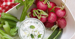 КАК ДЕЛАТЬ: Не разрезая лайм, натри на мелкой терке его цедру и выжми сок из самого плода. Фету разомни вилкой, смешай с соком и цедрой лайма и оливковым маслом, добавь к соусу мелко нарезанные листья мяты и молотый перец. Подготовь овощи, которые вы будете макать в соус: редис и зеленый лук очисть от корешков, а стебли сельдерея и огурцы разрежь на брусочки.