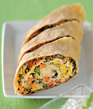 4. Раскатайте тесто на листе пергамента, затем очень аккуратно растяните его руками, чтобы тесто стало тонким. Выложите на тесто овощи, оставив с каждого края по 3 см, и заверните их внутрь, на начинку. Сверните рулет, смажьте яйцом и выпекайте в разогретой до 200 °С духовке 35–40 мин.