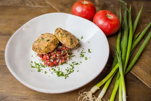 Томаты, надрезанные крестиком, опустить в кипящую воду на 30 секунд. После поместить в холодную воду со льдом. Снять шкурку, нарезать кубиком конкосе (без семечек). Поместить в сито и дать стечь. Нарезать мелко зеленый лук и петрушку. Репчатый лук натереть на мелкой терке и также дать стечь в сите. Все перемешать, добавить яйцо, панировочные сухари, чеснок, томатную пасту, сахар, соль. Еще раз все перемешать и дать настояться в холодильнике 3-4 часа. В сковороде с высоким бортом разогреть масло. Сформовать котлетки, обвалять в муке и опустить в масло. Жарить 3-4 минуты до появления корочки. Достать, положить на салфетку, дать стечь лишнему маслу.