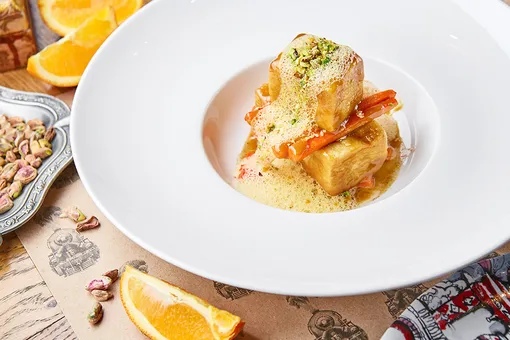 Сыр тофу нарезать одинаковыми кусочками, обвалять в крахмале и обжарить на растительном масле. Чтобы приготовить соус Карри, нужно довести до кипения кокосовое молоко, добавить желтую пасту Карри, сахар, сок лайма и выпарить до половины объема. Добавляем соус Карри и тушим на медленном огне. Отдельно нарезать крупными брусочками морковь, добавить сахар и обжарить. Если морковь получается сухая, то нужно добавить немного дистиллированной воды, в конце обжарки морковь посыпать обжаренным кунжутом. На тарелку выложить морковь, сверху сыр тофу в соусе Карри, полить апельсиновой пеной и посыпать фисташками.