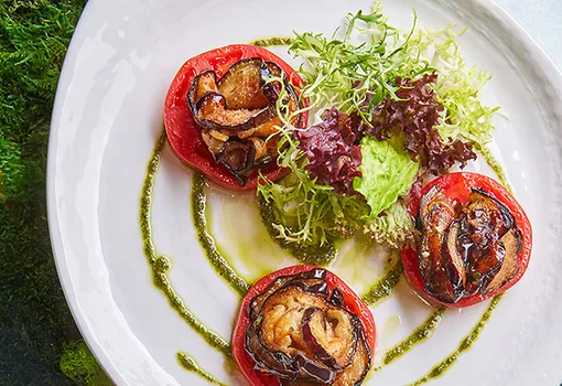 Баклажаны замариновать с чесноком, кинзой, соевым соусом, маслом растительным и томатно-имбирным соусом, прожарить до готовности. Чтобы приготовить томатно-имбирный соус, смешайте соус чили, пасту Том Ям, кетчуп, сахар и соль. Выкладываем баклажаны на помидоры, украшаем миксом салата.