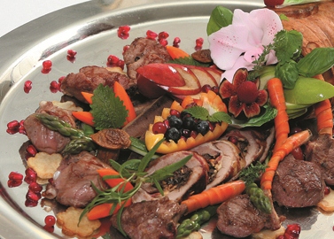 6. Далее на хорошо разогретой сковороде-гриль обжарить в оливковом масле (100 г) мари-нованные корейку ягненка и утиную грудку, а также корейку теленка и кусочки отварного говяжьего языка до степени medium.