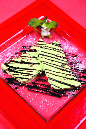 1. Семифреддо с мятой разрезать на 2 прямоугольных кусочка, выложить на середину десертной тарелки в виде пирамидки, полить черным растопленным шоколадом, посыпать сахарной пудрой.