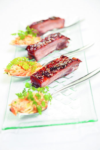 Шеф-повар Чарли Эйрд утверждает, что праздничный рецепт свиных ребрышек в томатном соусе вбирает в себя оттенки вкусов различных овощей, в соседстве с которыми она варилась. Замариновав готовые ребрышки в томатном соусе и посыпав их обжаренным белым кунжутом, можно добиться гармонии во всех смыслах, ничуть не умаляя первенства мяса в блюде. Салат и кервель призваны дополнить вкусовые ощущения.