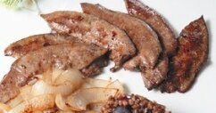 8. Печень тонко нарезать, панировать в пшеничной муке, отдельно обжарить на растительном масле с двух сторон до золотистой корочки;