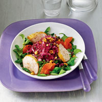 ![]() | ВИТАМИННЫЙ САЛАТ ТЕБЕ ПОТРЕБУЕТСЯ: * 0,5 кг краснокочанной капусты * 30 г измельченного фундука * 2 розовых грейпфрута * 3 ст. ложки лимонного сока * 1 ст. ложка сахара-песка * 3 ст. ложки орехового масла * 200 г копченой куриной грудки * 75 г салата руккола КАК ПРИГОТОВИТЬ: Сними верхние листья с кочана, разрежь его на 4 части и удали кочерыжку. Капусту тонко нашинкуй, уложи в дуршлаг, обдай кипятком и отставь его (пусть вода стечет, а капуста остынет). Фундук обжарь до золотистого цвета. Грейпфруты очисти и нарежь кусочками. Приготовь заправку: смешай сок грейпфрутов с лимонным, сахаром и ореховым маслом. Полей капусту заправкой. Затем выложи капусту и салат руккола в красивую миску, добавь куриную грудку, нарезанную кусочками, фундук и грейпфруты. Посоли и поперчи по вкусу. |