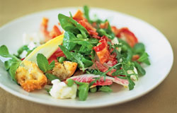 • В миске смешай хлеб с небольшим количеством оливкового масла и грудинкой, посоли и поперчи. Распредели хлеб по противню и положи сверху ломтики грудинки. Помести в духовку и готовь в течение 20 минут или пока грудинка не станет хрустящей, а хлеб золотистым.