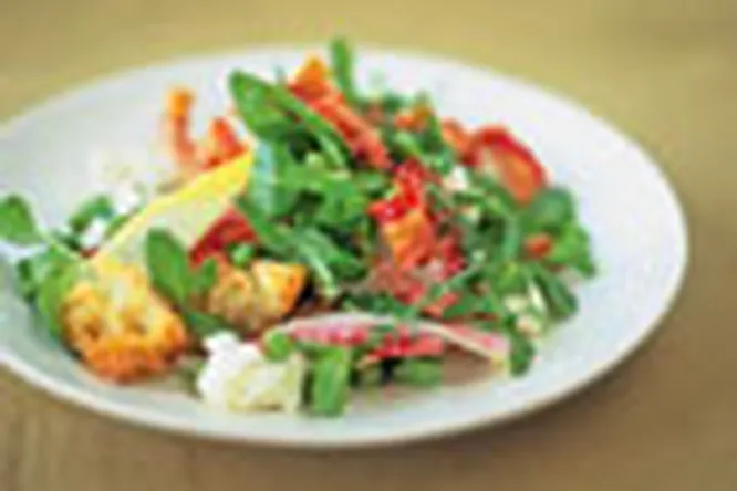 • Выдави сок лимона в миску и смешай его с оливковым маслом в соотношении один к трем. Добавь в миску сыр и горох, посоли и поперчи. Теперь покроши в салат хрустящий бекон и подсушенный хлеб и хорошенько перемешай все ингредиенты.