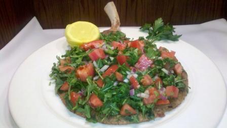 7. Порежь кубиками помидор, листья салата и лук. Выложи на тарелку куски мяса, а сверху покрой их овощной смесью, приправленной лимонным соком.