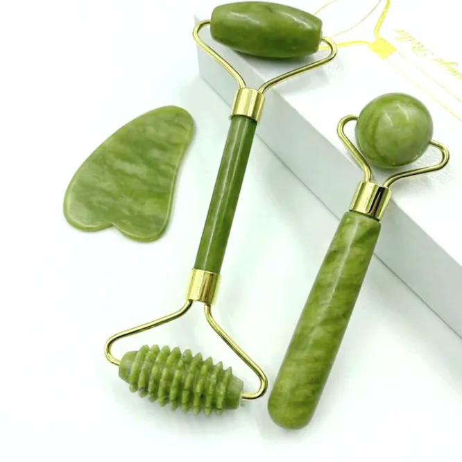 Особенности: Роликовые массажеры для лица бывают и из натуральных материалов. Нефритовый массажер отлично подходит для утренней бьюти-рутины, когда нужно разогнать отеки. Также в набор входит классический камень гуаша и ребристый роллер, который повышает эффективность проникновения уходовых средств в кожные покровы.