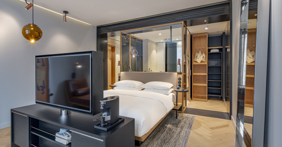 В отеле представлено 277 просторных номеров и сьютов, выполненных в стиле лофт, из которых открывается захватывающий вид на город и Альпы. При оформлении интерьеров дизайнеры использовали традиционные декоративные элементы в современной интерпретации. Мини-бар в каждом номере наполнен баварскими закусками и напитками региона. Мебель и принадлежности для ванной были изготовлены компанией La Bottega и известным немецким ювелирным домом Saskia Diez. Изюминку номерам добавляют необычные диваны, напоминающие винтажные автокресла и выполненные по особому заказу специально для отеля.