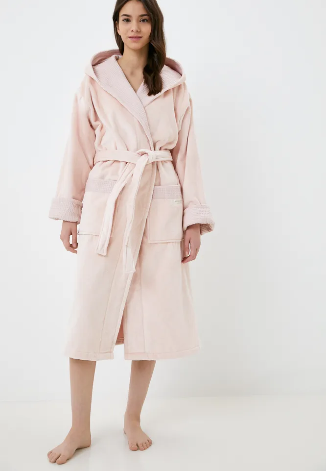 Она может носить этот уютный халат весь день. А особенно приятно в него укутаться по утрам и после душа. Модель выполнена из 100% хлопка и имеет красивый пудровый цвет.