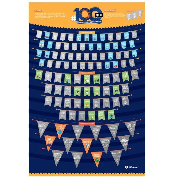Отличный постер для подростков, которые стремятся жить лучше. Этот постер выполняет функции мотивационной карты. Задания, которые спрятаны под каждым квадратом, непростые и их невозможно исполнить здесь и сейчас, но они послужат отличными маяками на будущую взрослую жизнь.
