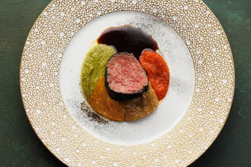 А медитативные, погружающие цветовые поля Марка Ротко, Дави переводит на язык сложных вкусовых гармоний и контрастов. В салате из омара прозрачное желе зеленого яблока, нежный авокадо и насыщенный устричный майонез с имбирем создают многослойную композицию, где каждый компонент, подобно мазку, вносит свой эмоциональный вклад в общее впечатление свежести и легкости.