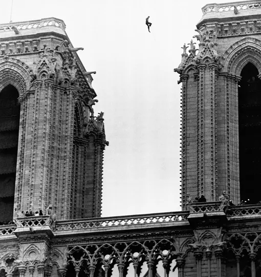 Июньским утром 1971 года весь Париж собрался на площади перед собором Парижской Богоматери. Затаив дыхание и приставив ладони козырьками ко лбам, чтобы не слепило солнце, все смотрели вверх – на натянутый между башнями собора трос. И на человека, лежащего на нем спиной в 68 метрах над землей. Мужчина встал, поднял свой шест для баланса и продолжил путь от одной башни к другой. Он несколько раз прошелся в обе стороны, то становясь на колени, то ложась на трос и даже жонглируя тремя булавами.
