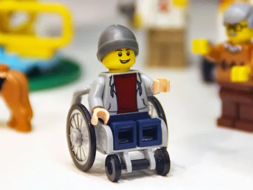 Компания Lego представила первую игрушку с инвалидностью еще в далеком 2016 году, после кампании #ToyLikeMe за включение игрушек с особенностями в торговые линейки. Персонаж на коляске – молодой человек в шапочке-бини. У него также была собственная собака-поводырь.