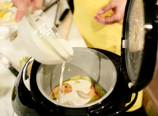 Шаг 3. Чеснок очистить, измельчить. Порезать кабачок кубиками. Включить режим «Мультиповар», установить температуру 160 °С, разогреть масло и обжарить чеснок и кабачки, 2 мин. Добавить креветки, сбрызнуть их лимонным соком, влить сливки, перемешать и уварить соус до загустения, 5 мин.