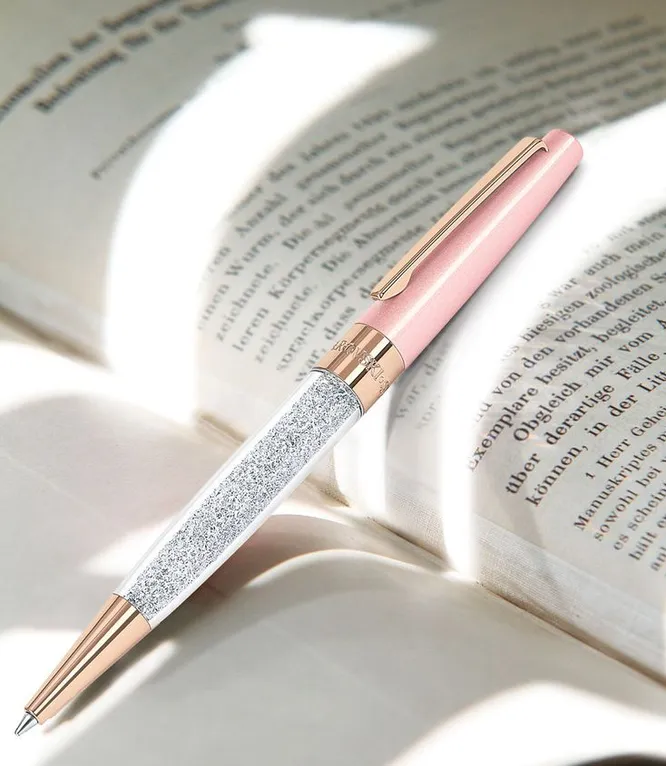 Этот аксессуар сделан из бижутерного сплава, покрыт лаковой отделкой и розовой позолотой, корпус украшен россыпью кристаллов Swarovski. Шариковая ручка – автоматическая: чтобы появился стержень, нужно повернуть верхнюю часть корпуса, и можно делать заметки и подписывать документы.