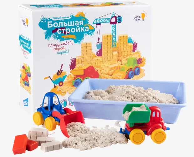 Какой ребенок не любит лепить из песка красивые фигурки и куличи и угощать ими сидящего рядом приятеля! Однако если работать с сыпучим материалом под присмотром родителей, можно обойтись без поглощения «пирожков». Тактильно умный песок напоминает обычный мокрый песок, только омытый волной. Он не прилипает к рукам, ничем не пахнет, не рассыпается, не застывает и не высыхает. При этом песочек стекает сквозь пальцы и отлично держит форму. В общем, настоящее чудо посреди снежной зимы! На радость родителям, контейнер прилагается, а еще грузовик и экскаватор.