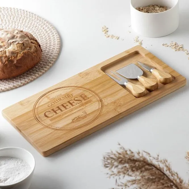 Деревянная подставка для сырной нарезки с тремя ножами в комплекте красиво смотрится на любом столе. Идеально подойдет для посиделок с подругами за бокалом вина.