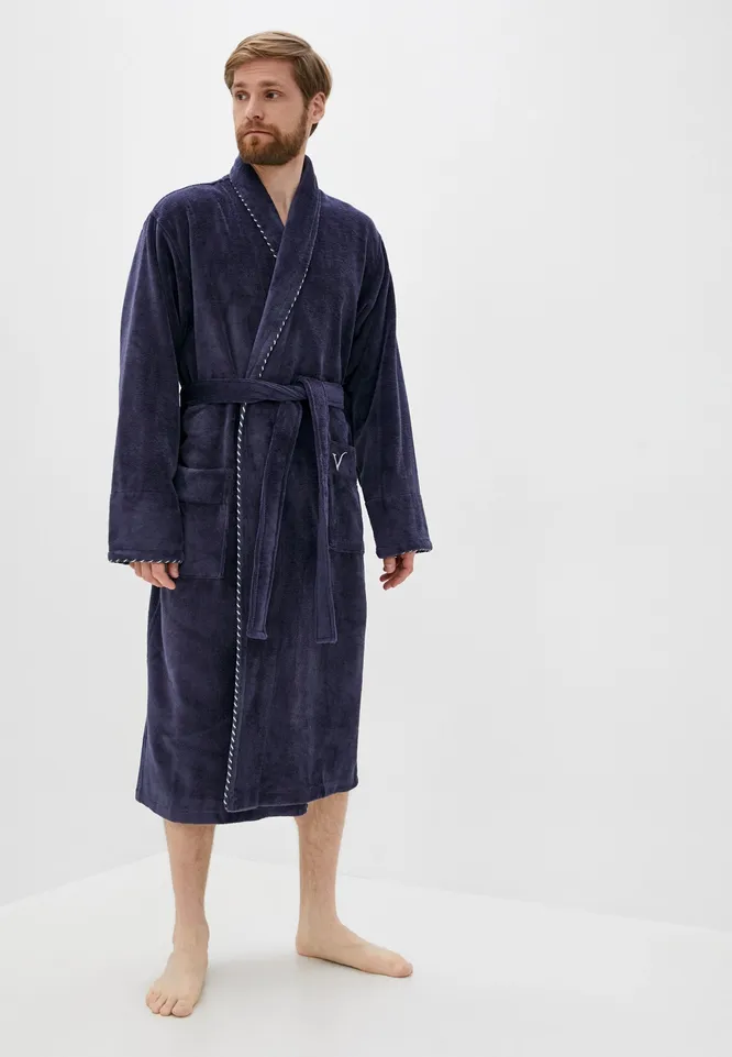 Фасон халата минималистичный: капюшона и броских брендовых логотипов нет, из украшений — контрастная декоративная строчка по краю халата. У этой модели два больших кармана, глубокий синий цвет, длина ниже колена и пояс. Домашняя одежда сделана из бамбука, хлопка и микрофибры — ткань приятная, но стойко переносит частую носку и стирку.