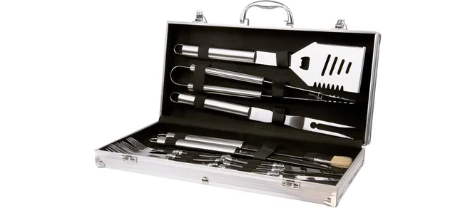 Набор профессионального мангальщика — новогодний подарок для чемпиона по блюдам на гриле и фаната шашлыков. В нем 13 предметов из стали: нож и вилка для мяса, лопатка, щипцы, кисточка для смазки — всё для готовки. Дополнительно - четыре столовые вилки и столько же столовых ножей для дегустации блюда на мангале. Все приборы хранятся в алюминиевом кейсе-футляре, удобном для транспортировки.