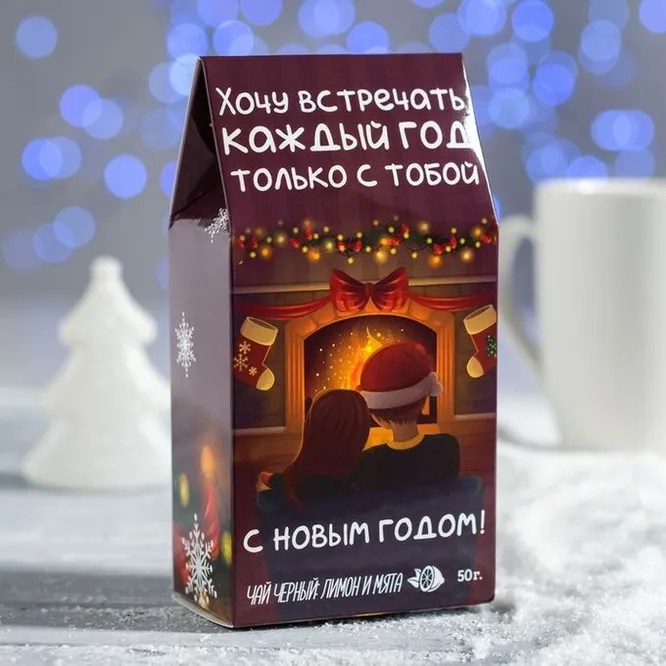 Черный чай с лимоном и мятой упакован в картонную коробку с изображением пары влюбленных перед камином и надписью «Хочу встречать каждый год только с тобой».